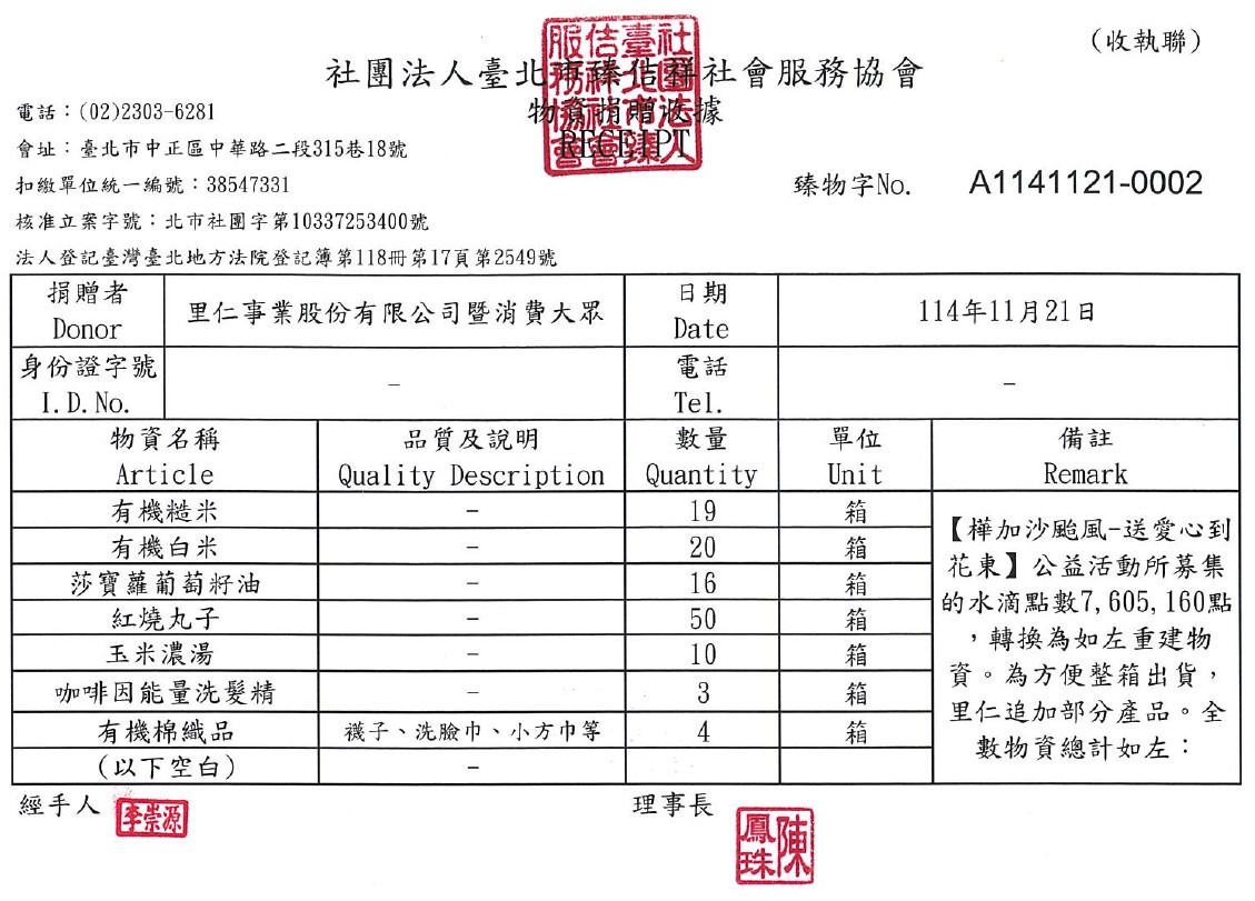 本活動所募集到的7,605,160水滴點 (價值NT$380,258) 已經轉為有機米、即食濃湯、調理包等食品,以及洗髮精和有機棉織品共122箱(實際捐贈物資總價值 NT$388,120),並於2025/11/21送至花蓮。這些重建物資將透過「臻佶祥社會服務協會-南機場食物銀行」分送給樺加沙颱風受災居民。