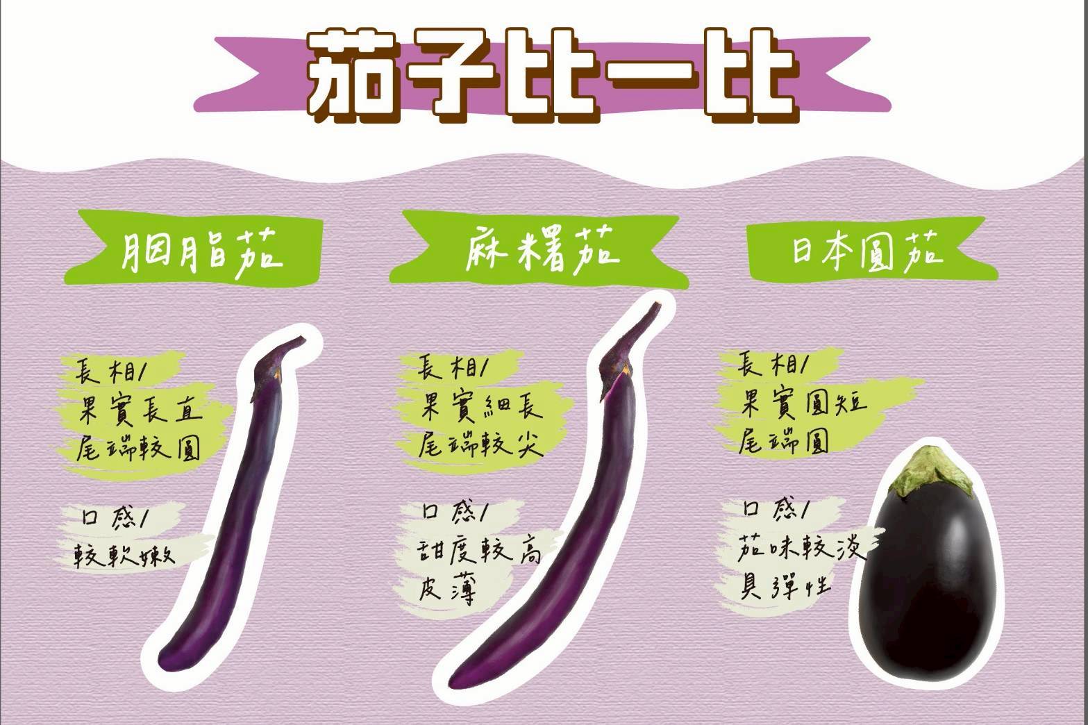 | 麻糬茄 | 長 40–45 公分、尾端較尖易彎、深紫色;夏秋為主 | 皮薄幼嫩、Q軟帶彈性、易入味;加熱後也能較好保存花青素 | 蒸、炒、煮、炸都可以;快炒蒜香、清蒸醬油薑汁超對味 |