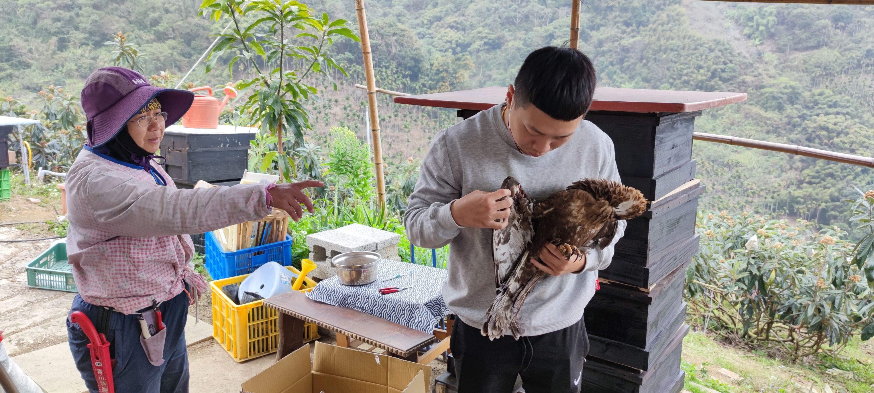 為了協助枇杷授粉,果園內放置了幾個蜂箱。詹貴溶回憶,有次聽到「咚!」一聲劇烈撞擊,把他們夫妻嚇壞了。一看原來是貪吃又莽撞的蜂鷹,衝得太猛撞傷了翅膀。曾勝彥趕緊向野生動物保育協會求救送去治療,一邊祈禱蜂鷹平安,盡顯對生靈的愛護 。