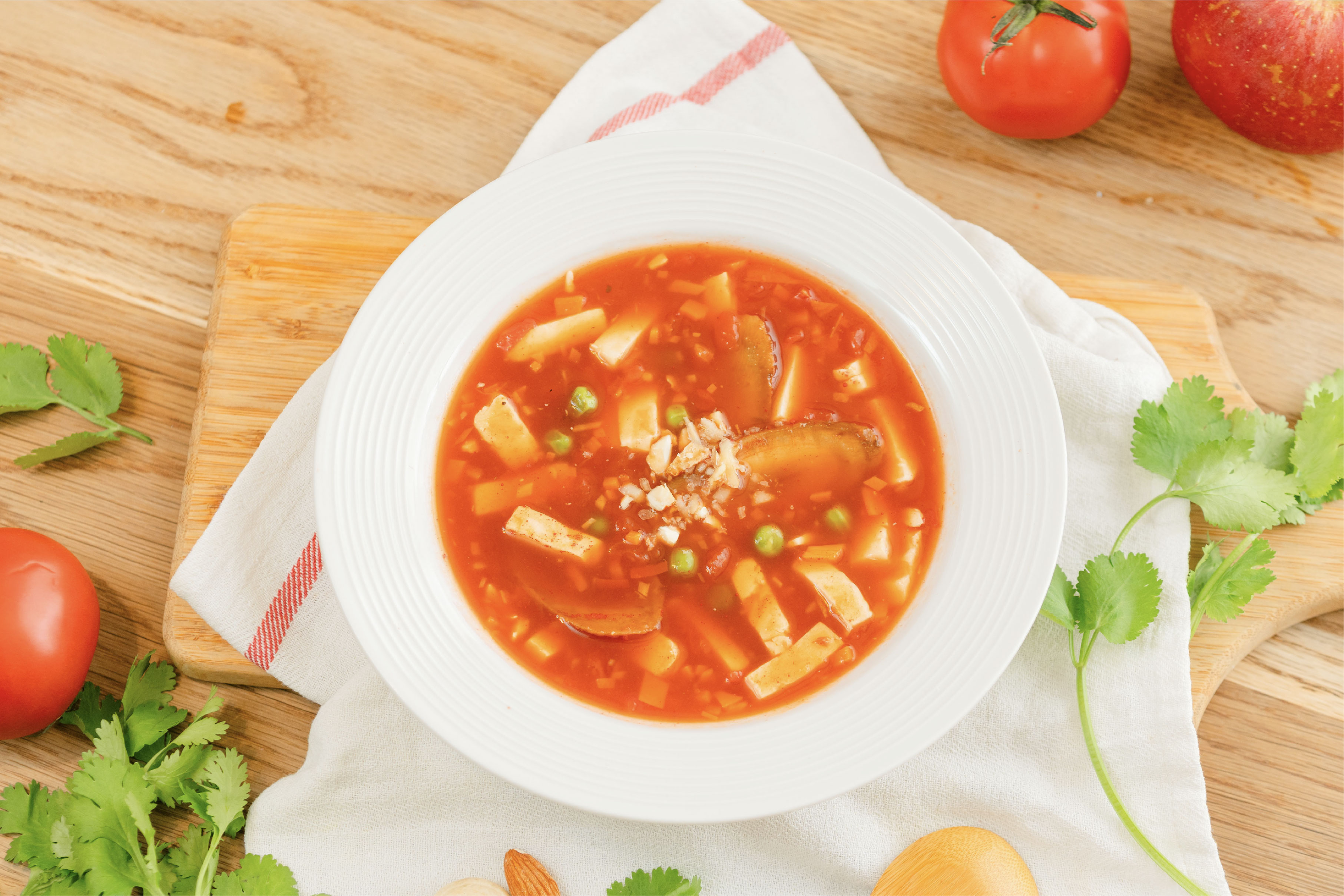 一點都不會!堅果在湯中有兩個作用:一是與番茄一起熬煮時,天然油脂能讓湯頭更濃郁滑順,且有助於脂溶性營養素(如茄紅素)的吸收;二是起鍋後撒上的堅果碎,能保留酥脆口感,讓喝湯也能享受到豐富的咀嚼樂趣。 - 如果沒有番茄汁,可以直接用新鮮番茄代替嗎?